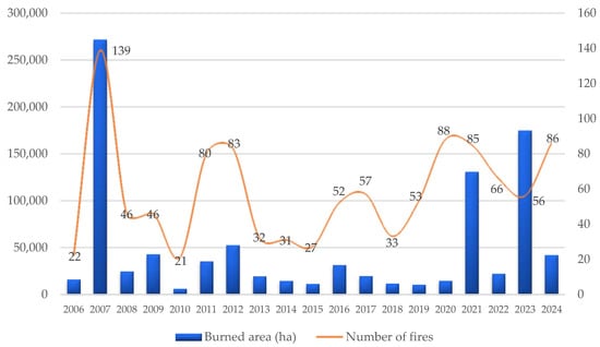 Wildfire Incidents and Burnt Areas (ha) in Greece (2006–2024). Fires mapped in EFFIS of approximately 30 ha or larger. Source: [,].