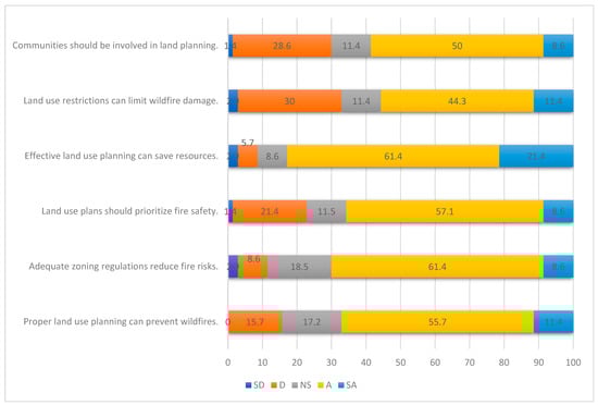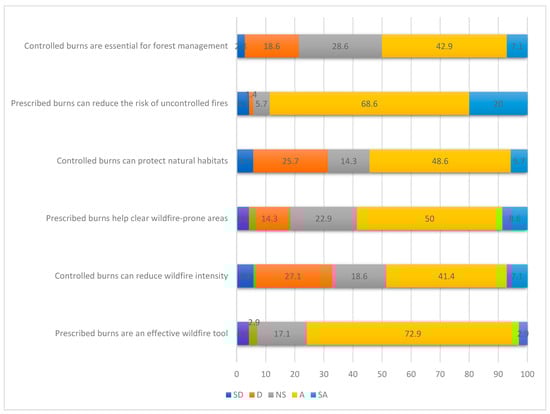 This educational diversity suggests that the study captured perspectives from individuals with varying levels of formal education, which could influence their understanding and approach to wildfire preparedness and management. When it comes to direct wildfire experience, the data showed that a substantial portion of respondents (27.8%) had encountered more than 10 wildfires, while 30.1% had experienced fewer than 2 wildfires. This distribution suggests a wide range of wildfire exposure within the sample. Geographically speaking, respondents were reasonably representative of the country’s distribution, with 40.9% from northern Greece, 32.1% from the islands, and 27% from southern Greece. This geographic diversity is vital for capturing regional perspectives on wildfire preparedness.