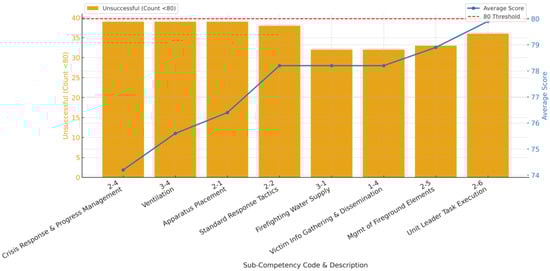 The greatest number of unsuccessful performances was observed for three sub-competencies, each with 39 candidates not meeting the required standard. In the Response Activities domain, sub-competency, Crisis Response & Progress Management (2-4) was failed by 39 out of 92 candidates, with an average score of 74.2 (the lowest mean score among all sub-competencies). An equally high failure count (39) was recorded for Ventilation (3-4) in the Firefighting Tactics domain, which had a mean score of 75.6. Similarly, Response Activities, Apparatus Placement (2-1) saw 39 unsuccessful attempts, with an average score of 76.4. Just below these, Standard Response Tactics (2-2) in Response Activities had 38 candidates unable to successfully complete the task, and an average score of 78.2. These results indicate that several critical response and tactical tasks posed considerable difficulty for a large portion of the candidates, as reflected by both high failure counts and comparatively lower average scores (in the mid-70 range).