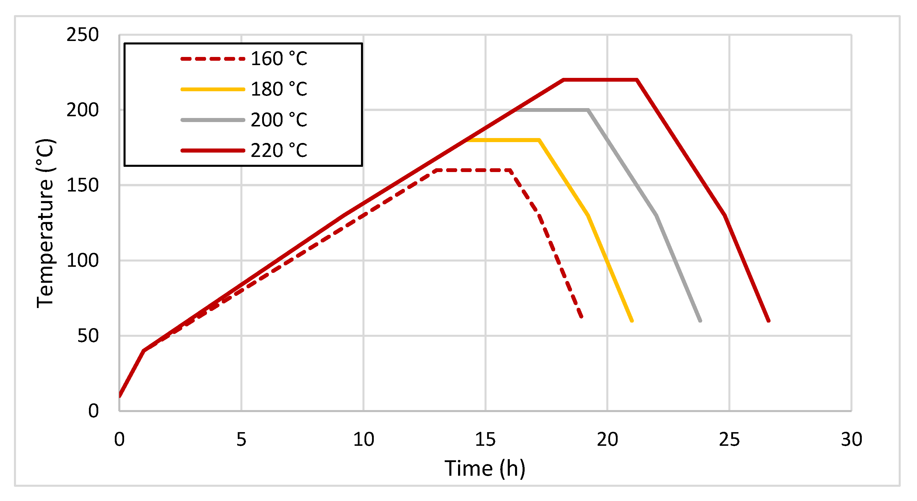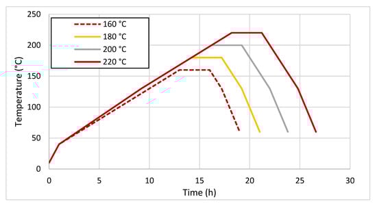 The temperature of the samples after the thermal treatment was approximately 40 °C. The course of the heating phases, modification and cooling for individual sample groups is illustrated in Figure 1.