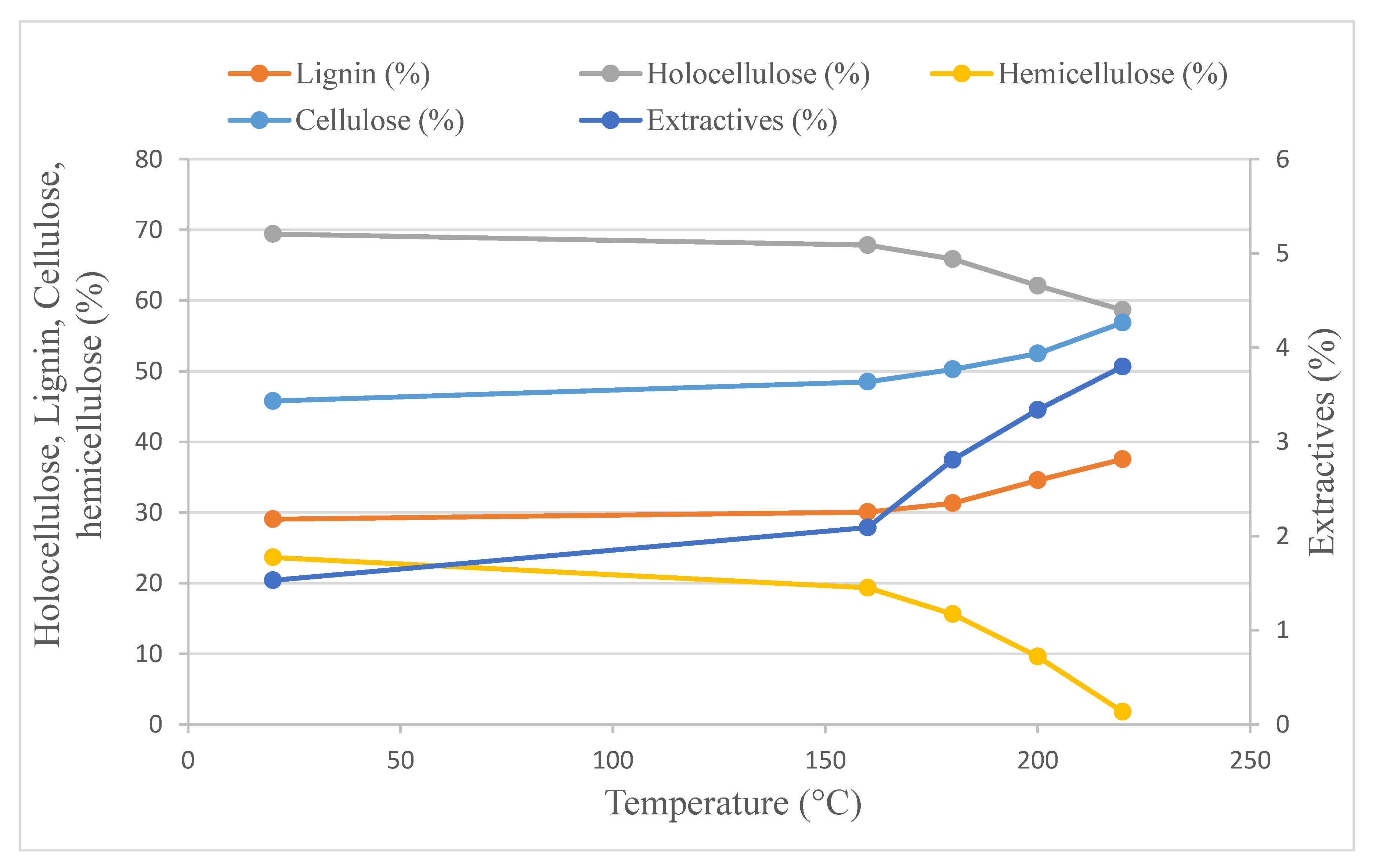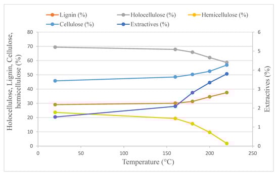 Hemicelluloses are the most affected by higher temperatures, and their content decreases by 92.43% at a temperature of 220 °C when compared to the original samples.