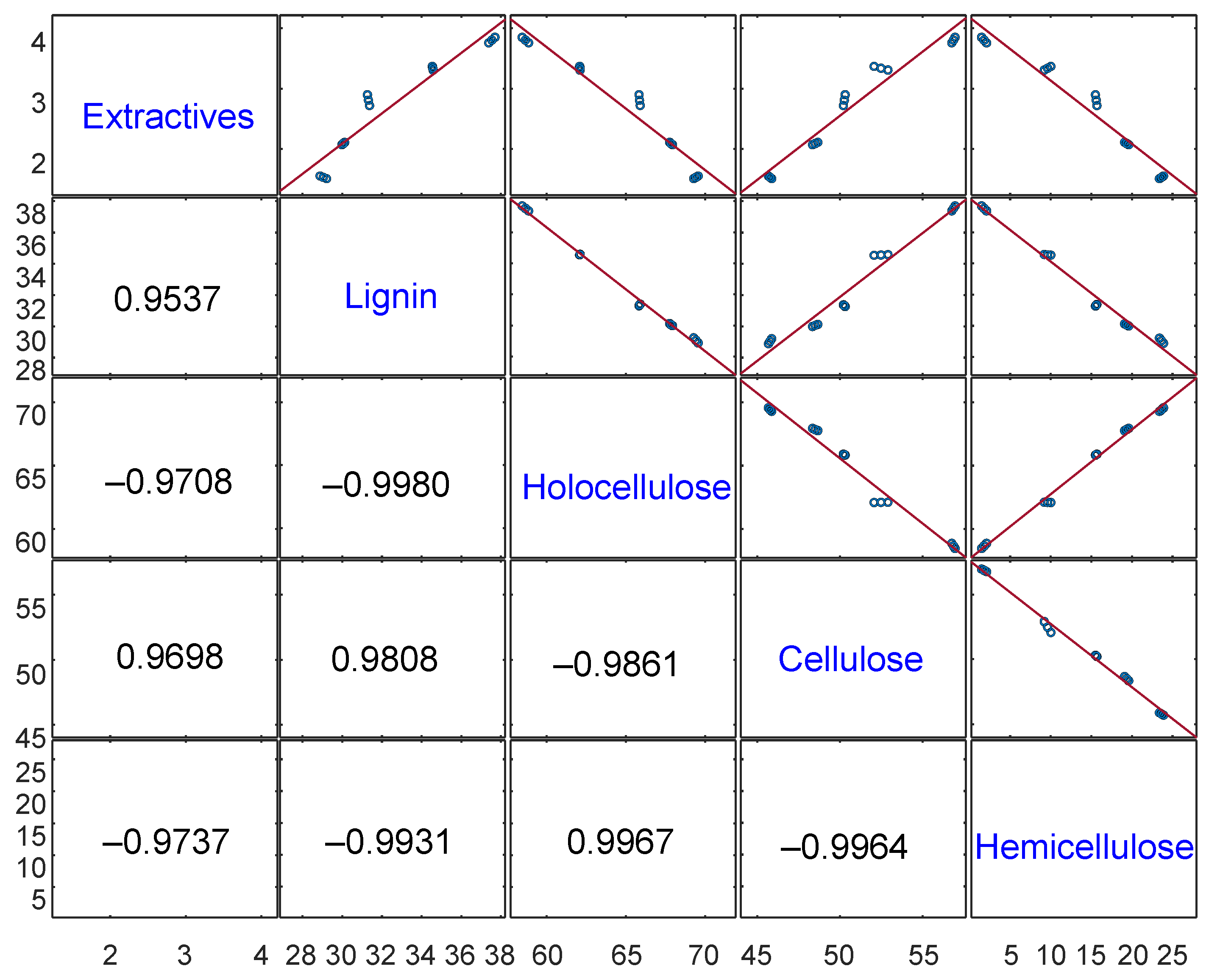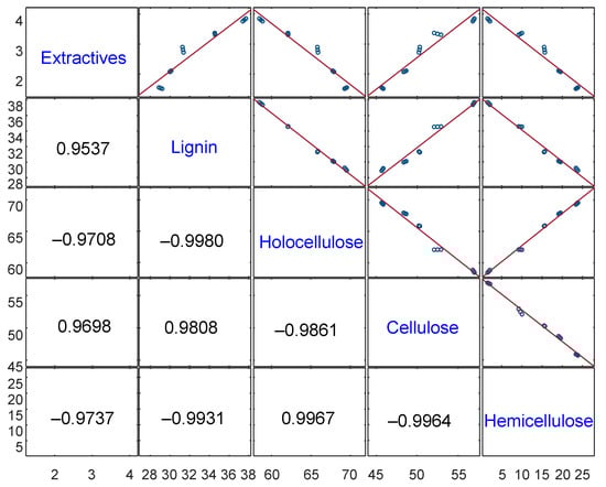 The dependence between the individual chemical components is shown in Figure 3. Positive values indicate a strong positive correlation between the wood components (extractives and lignin, Pearson r = 0.9537, p < 0.001, R2 = 0.9090, n = 15). Conversely, negative values indicate a strong negative correlation between the wood components (extractives and holocellulose, Pearson r = –0.9708, p < 0.001, R2 = 0.9425, n = 15).