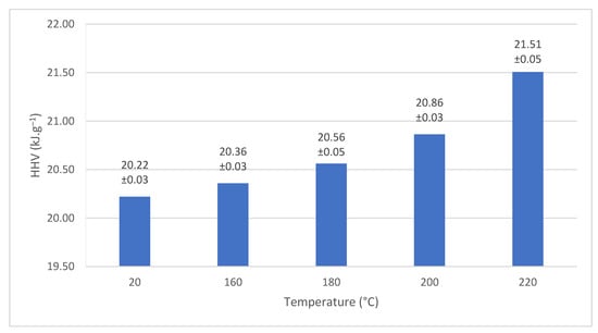 HHVs determined by calorimetry for the control samples and thermally treated meranti wood are shown in Figure 4. The results show that HHVs increase with wood treatment temperature. The increase in HHV was 6.0% at a temperature of 220 °C compared to a temperature of 20 °C.