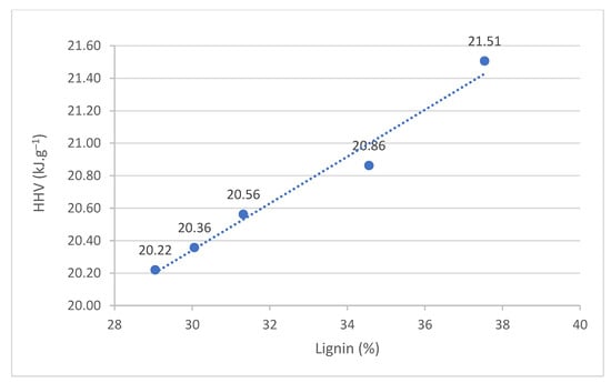 The results show that after thermal treatment of wood, the increase in HHV was caused by an increase in the content of lignin, cellulose, and extractives. However, HHV of polysaccharides is lower than HHV of lignin and extractives []. The dependence between HHV and the content of extractives is not as strong as in the case of lignin. At the same time, extractives can be isolated from wood with various solvents. The method used to separate these substances can also affect the regression analysis. In addition, softwood contains resins and terpenes and has a higher lignin content and a different structure than hardwood.