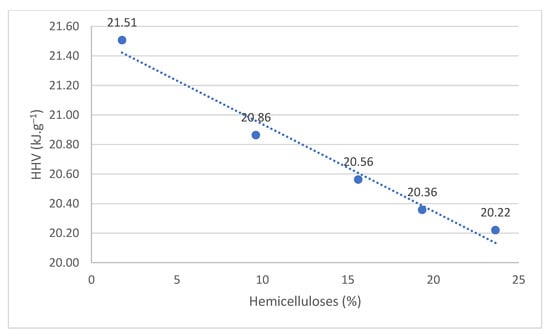 A linear regression has been confirmed between HHV and the content of extractives, holocellulose, cellulose, lignin, and hemicellulose. The coefficients of determination are shown in Table 4. HHV depends on the chemical composition of the wood [,]. HHV were positively correlated with the extractives, lignin, and cellulose content (Figure 5, Figure 6 and Figure 7). A negative correlation was found between HHV and holocellulose and hemicelluloses (Figure 8 and Figure 9).