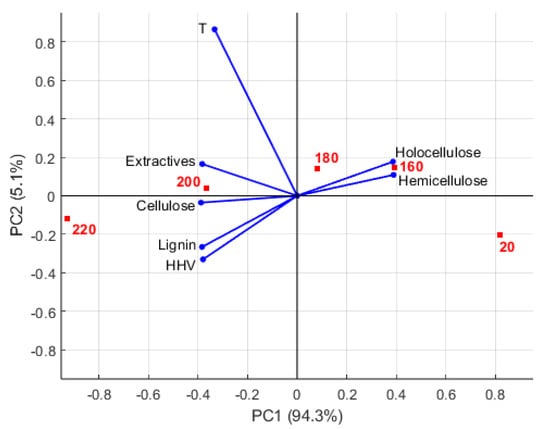 Samples with higher PC1 scores treated at lower temperatures (160 °C, 180 °C) show a higher content of hemicelluloses, holocellulose, and less lignin (a lower content of extractives and a lower HHV is also identified). Samples thermally treated at higher temperatures (200°, 220 °C) which contain more lignin, extractives, and cellulose have lower PC1 scores. PC1 therefore monitors the effect of temperature on chemical composition. The result of analysis corresponds to the degradation of wood. PC1 thus represents the degree of degradation of the chemical components of wood.