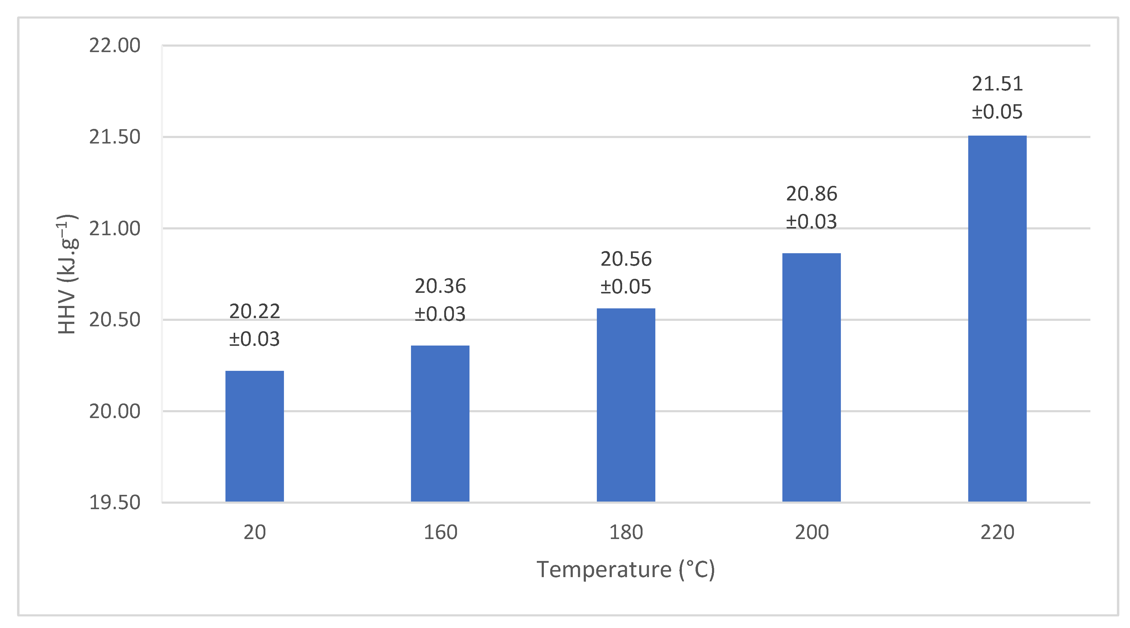Wood chips from control samples and every treatment temperature samples were oven-dried at 105 ± 2 °C until constant mass before determination of higher heating values. The values of HHV are presented as mean ± SD (n = 5 samples per temperature).