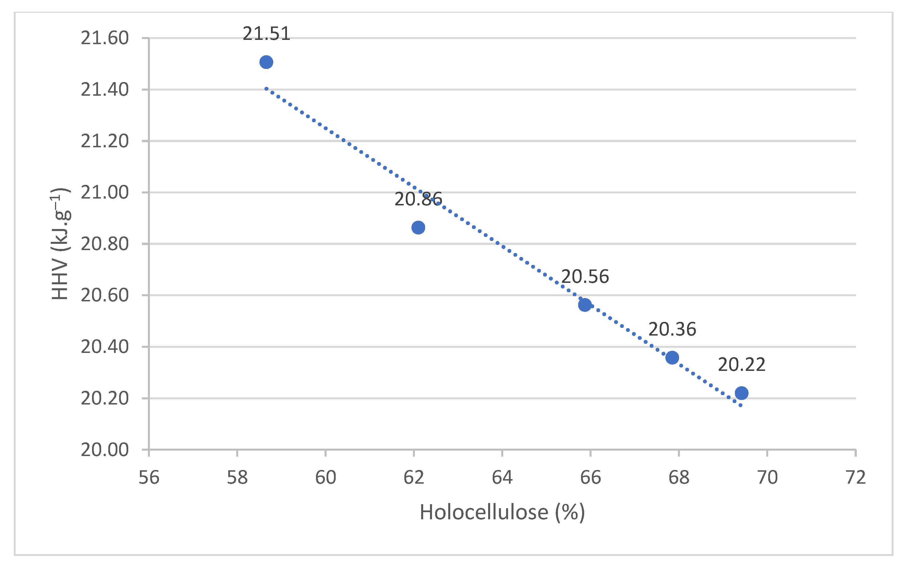 Relationship between HHV and holocellulose.