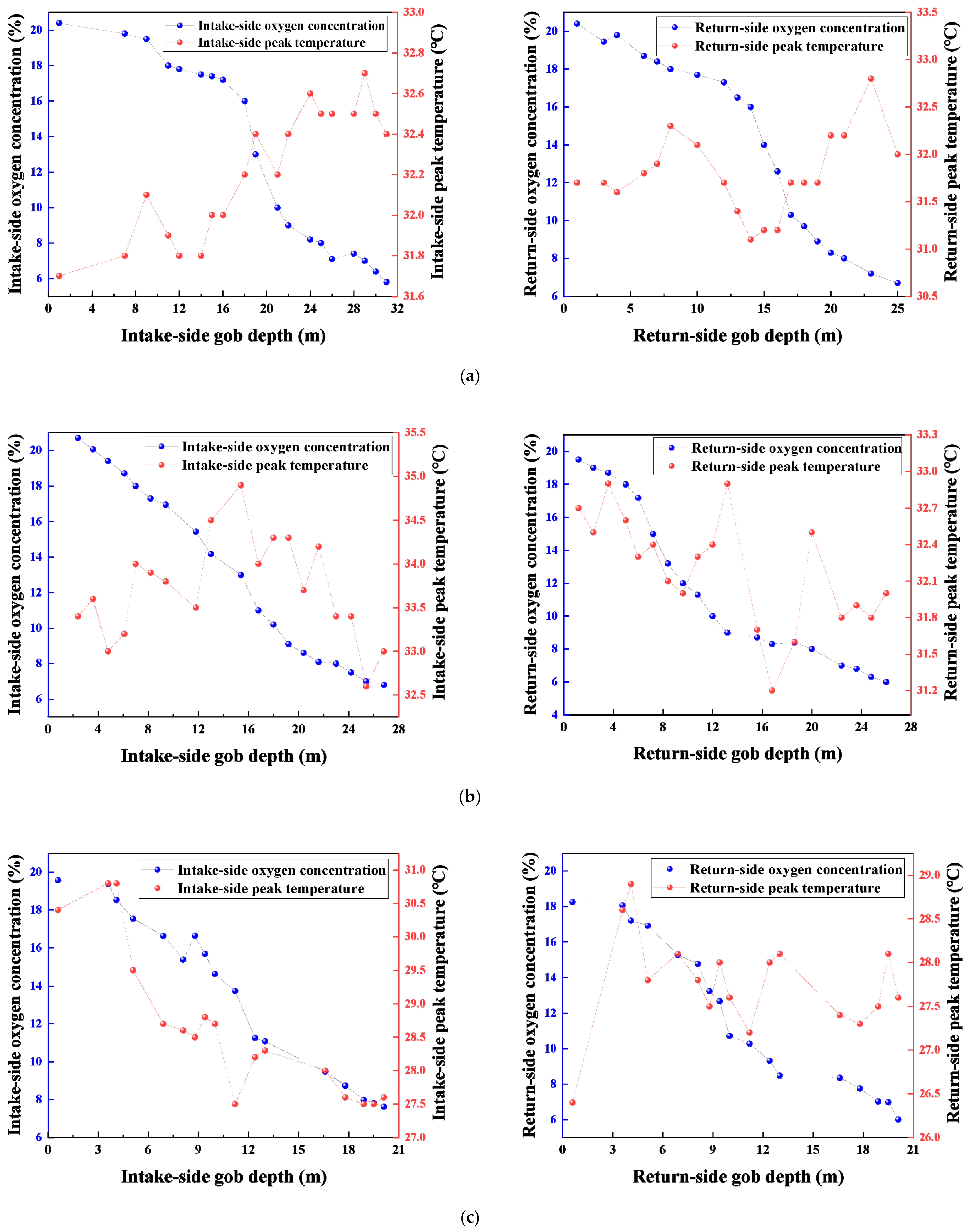 Figure 11 shows that when the advancing rate of the working face decreases from 3.6 m/d to 0.15 m/d, the initiation depth of intake-side oxidation zone shortens from 16.1 m to 3.97 m, the initiation depth of intake-side asphyxiation zone shortens from 38.1 m to 15.6 m, the initiation depth of return-side oxidation zone shortens from 13.48 m to 2.68 m, and the initiation depth of return-side asphyxiation zone shortens from 35.05 m to 14 m. This phenomenon reveals the dynamic coupling relationships between the advancing rate and the distribution of spontaneous combustion three-zone in gobs: As the advancing rate decreases, the distribution of oxygen will also diffuse near gobs, and the oxidation zone and the asphyxiation zone are getting closer and closer to the working face, and the widths of the oxidation zone and the asphyxiation zone also decrease. This is because the slower the advancing rate, the less the air leakage volume will be. As a result, the oxygen in gobs can fully react in time, leading to an increase in the amount of oxygen consumed. This causes the oxygen distribution to penetrate near gobs, thereby decreasing the width of the oxidation zone and asphyxiation zone. These findings establish a theoretical basis for preventing spontaneous combustion in gobs.