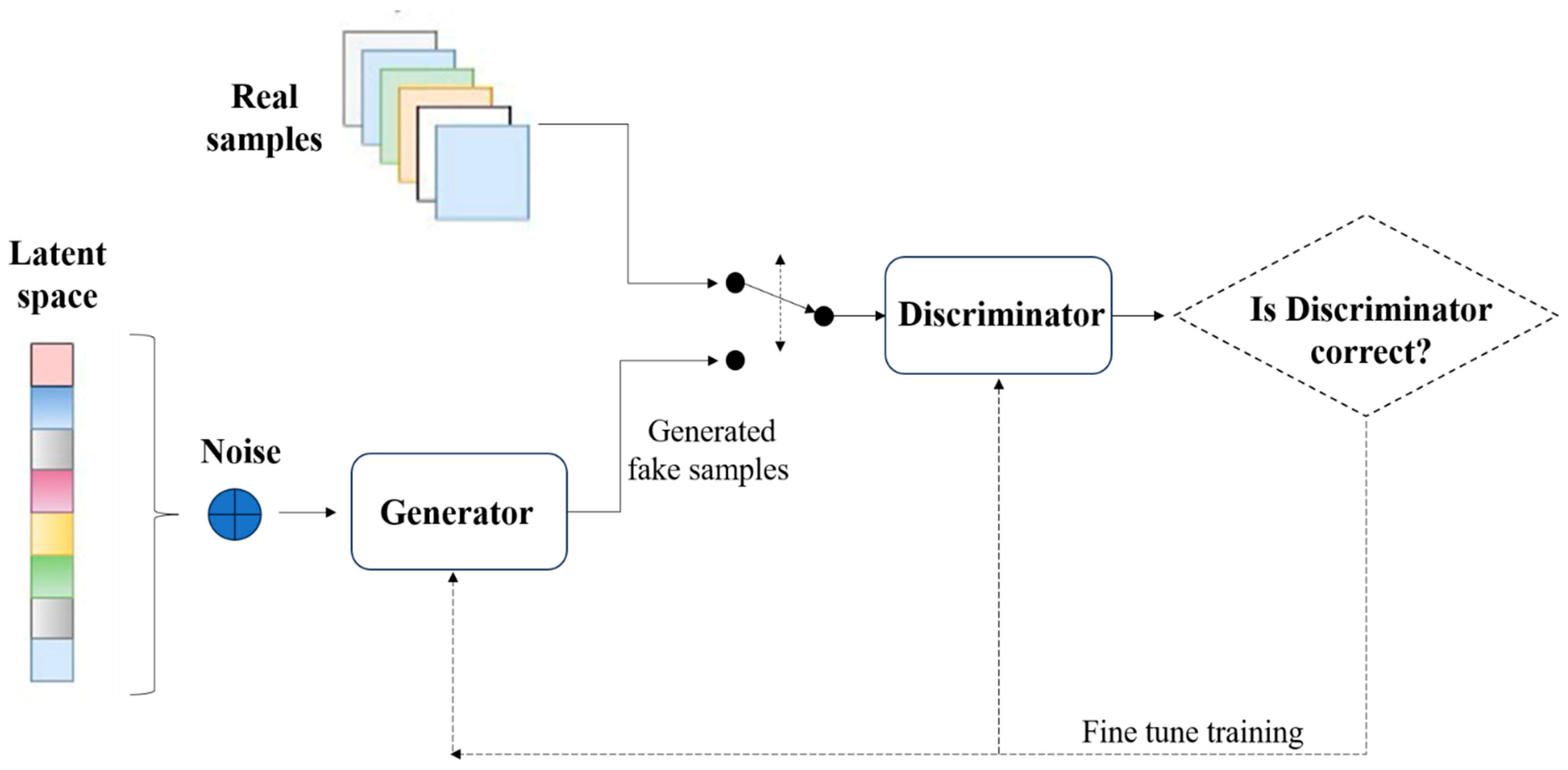 The GAN model primarily consists of two adversarial neural networks: the generator network and the discriminator network. The generator network is responsible for producing synthetic data, while the discriminator network evaluates whether the input data are real or generated. The generator continuously optimizes its output to deceive the discriminator, while the discriminator simultaneously refines its ability to distinguish real from synthetic data. This adversarial interplay drives mutual improvement. The model architecture is illustrated in Figure 3.