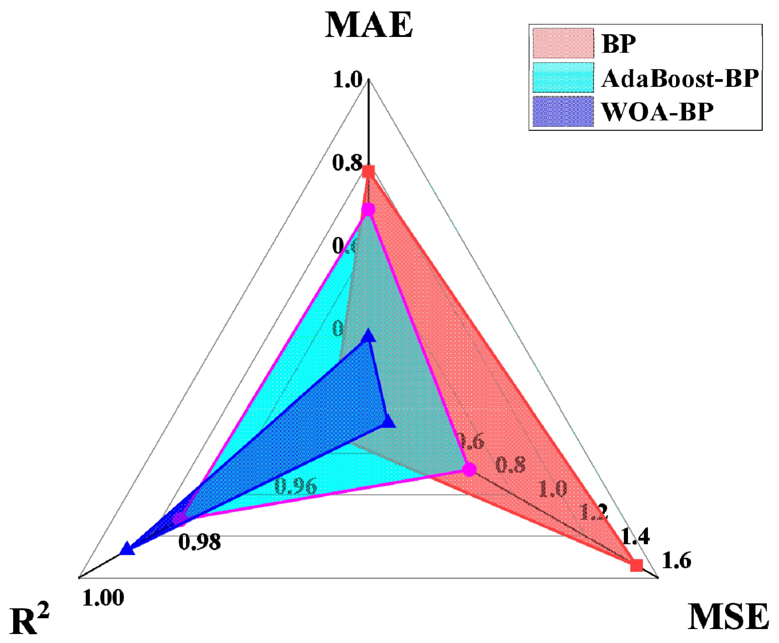 To verify whether the WOA-BP model effectively improves accuracy, this work conducted a comparative analysis to examine the variations in performance evaluation indicators and the predictive accuracy of the BP, AdaBoost-BP, and WOA-BP models.