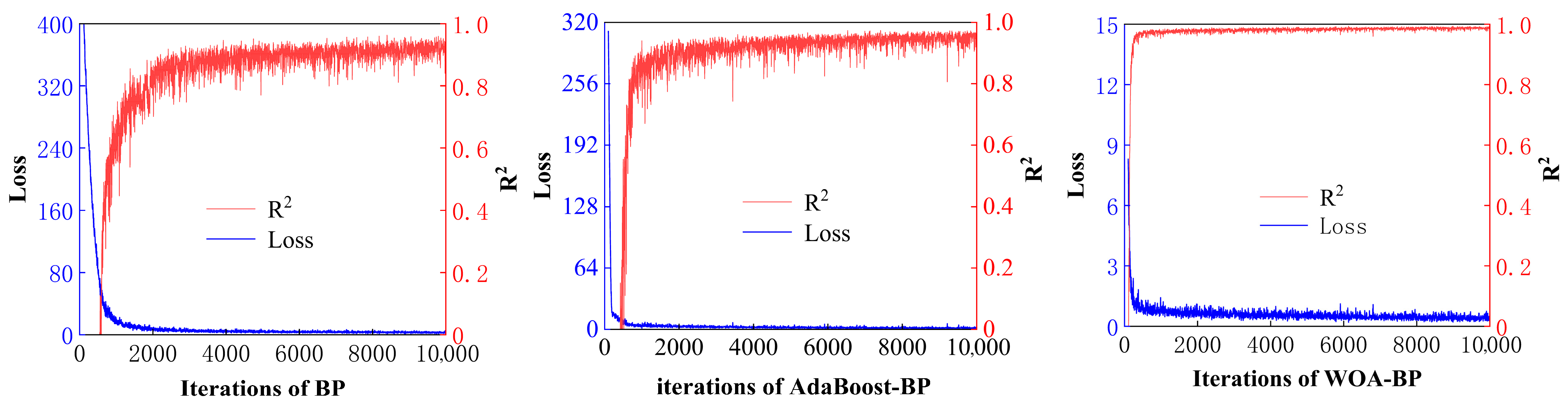 Figure 7 shows the training processes of the BP, AdaBoost-BP, and WOA-BP models—mainly the changes in training loss and determination coefficients. It can be seen that the WOA-BP model converges approximately after 700 iterations, with the fastest convergence, the smallest overall fluctuation, the lowest loss, and the highest determination coefficient. However, BP converges the slowest and has the greatest overall fluctuation. This is because neural networks need to constantly adjust weights and biases and require more iterations and time to converge. The AdaBoost-BP model converges slowly and has a large overall fluctuation. The effect after 10,000 iterations is better than that of the BP model. This might be because multiple base models need to be adjusted, the training time is longer, and the results after combining multiple base models are better than those of a single BP model.