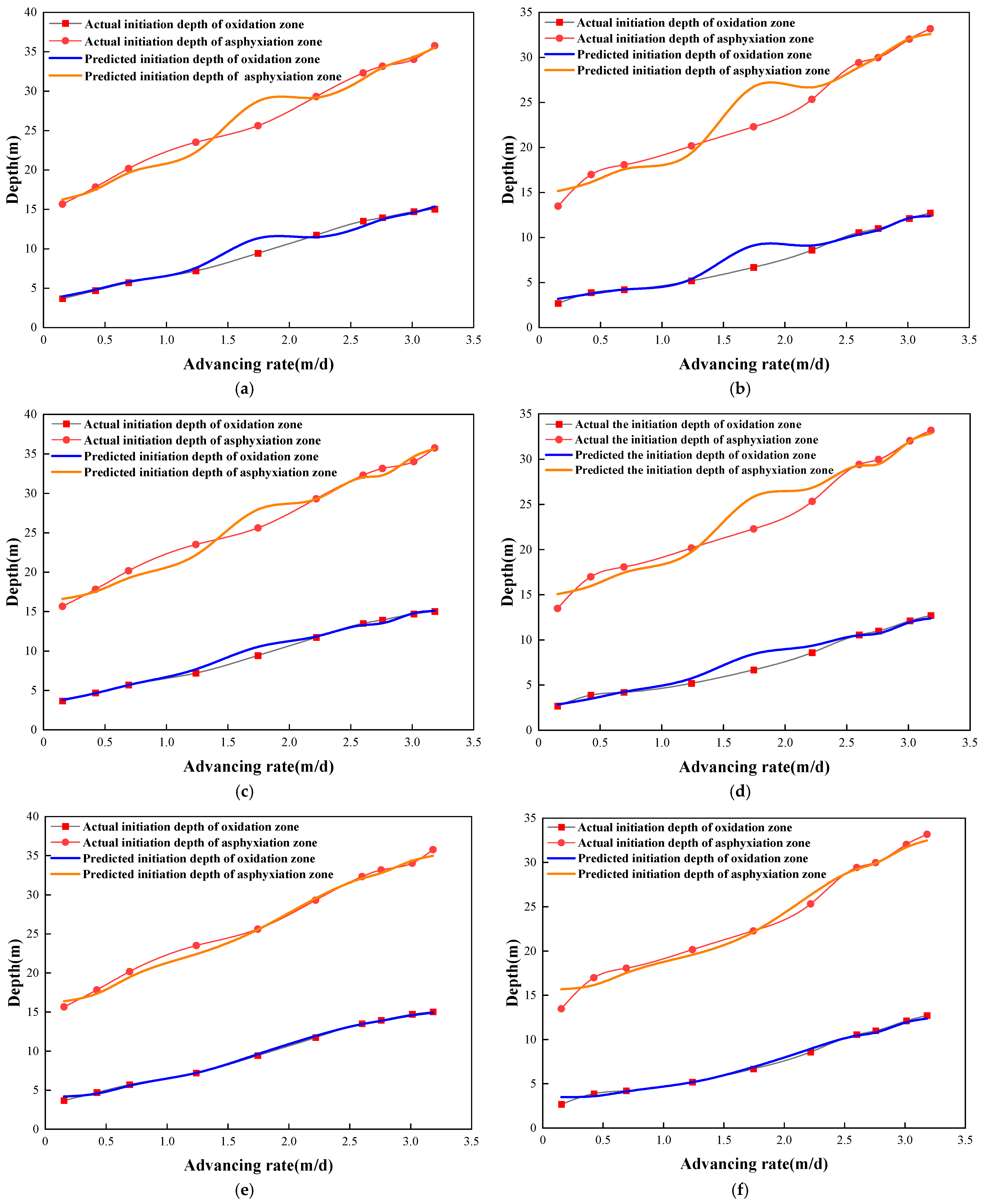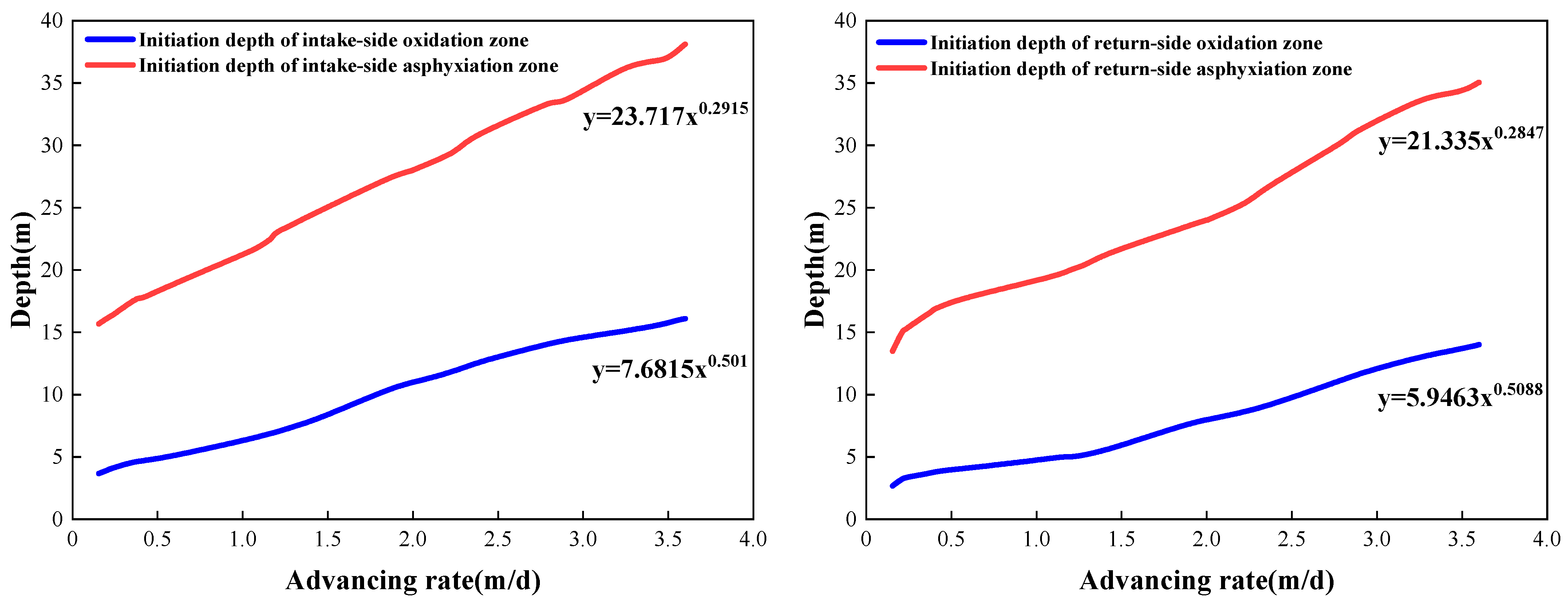 Based on the trained WOA-BP model, predictions were made for the initiation depth of oxidation zone and asphyxiation zone on both sides of gobs. These led to the determination of the fitting relationships formula between advancing rate and the initiation depth of oxidation zone and asphyxiation zone in gobs during the terminal mining phase. The results are illustrated in Figure 11.