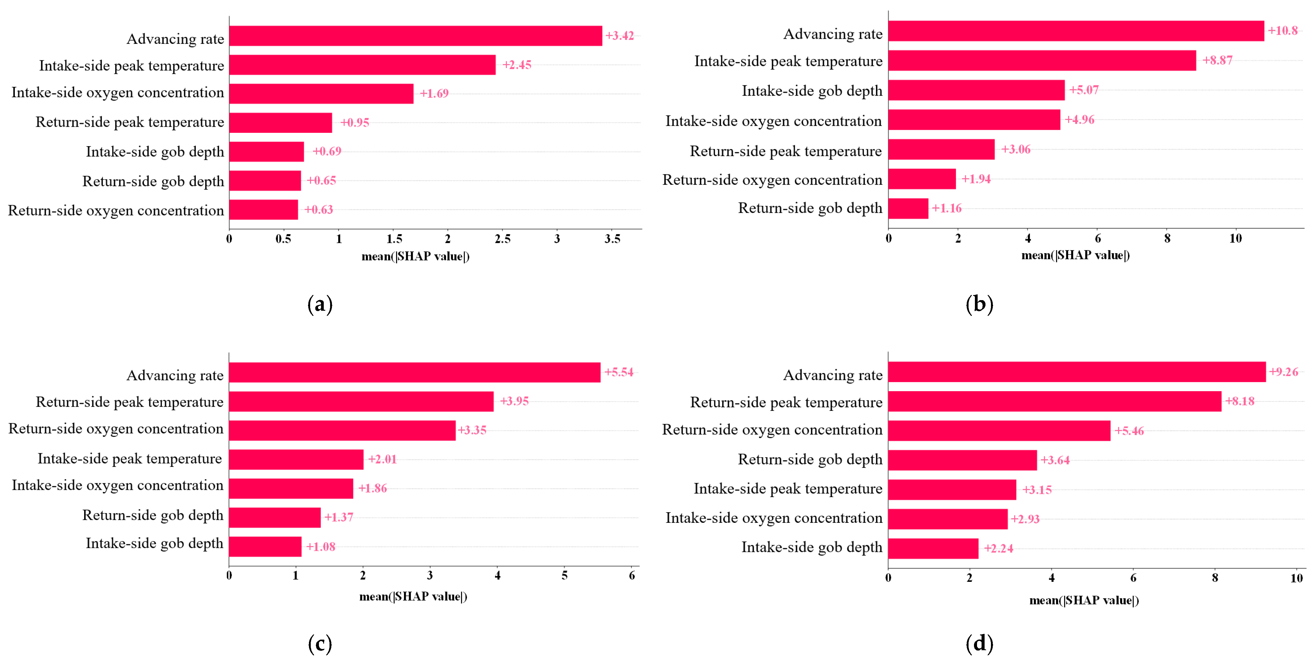 The SHAP feature analysis indicates that the advancing rate contributes the most to the initiation depth of the oxidation zone and asphyxiation zone on both sides. In order to achieve the best prediction effect when predicting the distribution of spontaneous combustion in three-zone gobs during the terminal mining phase, it is obvious that the advancing rate should be given priority.