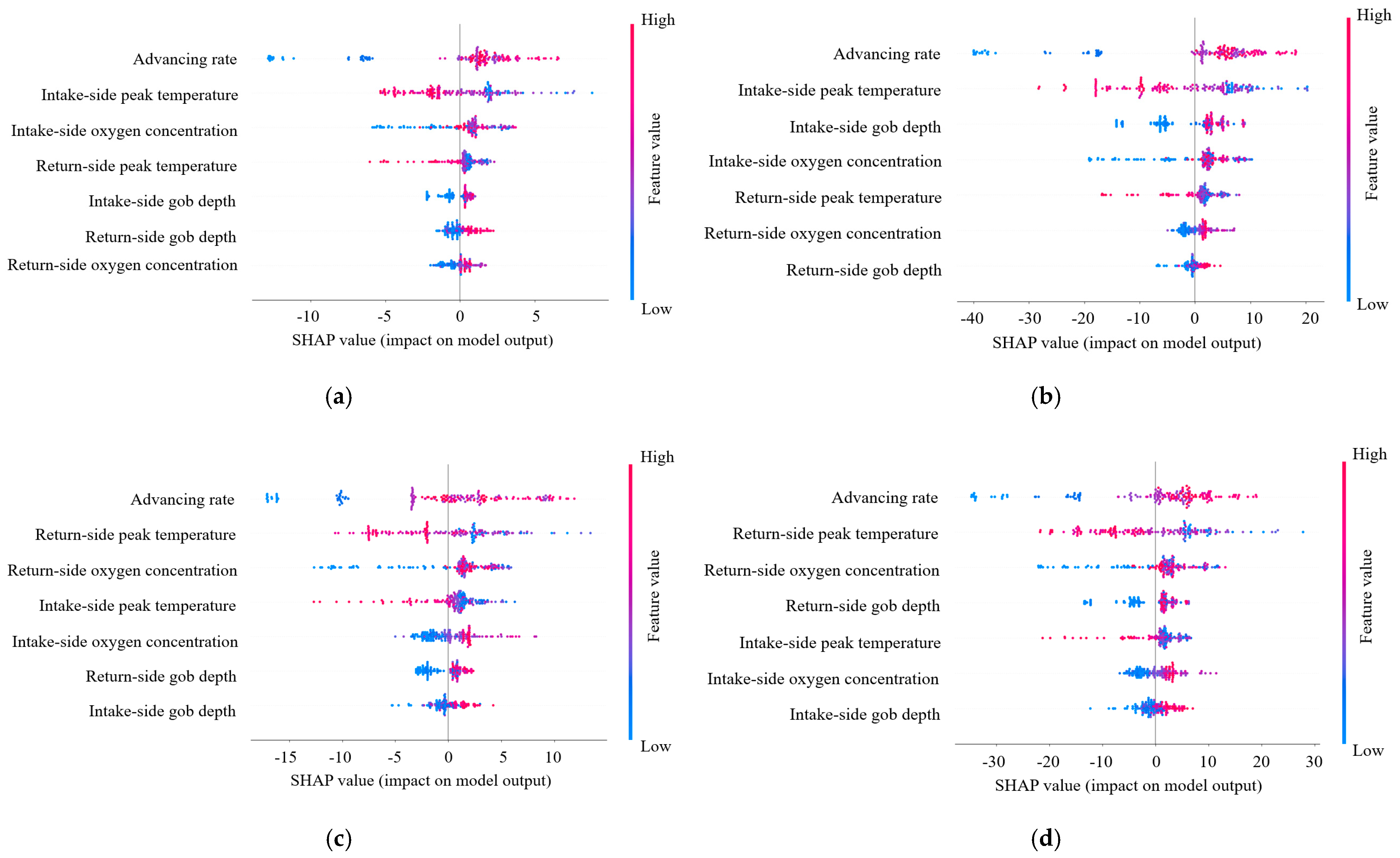 Figure 10. Bee swarm plot based on SHAP feature analysis. (a) Impact of input characteristics on intake-side oxidation zone depth; (b) impact of input characteristics on intake-side asphyxiation zone depth; (c) impact of input characteristics on return-side oxidation zone depth; (d) impact of input characteristics on return-side asphyxiation zone depth.