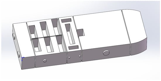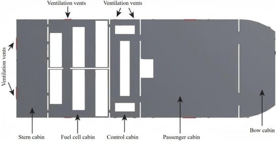Since hydrogen leakage originates in the fuel cell compartment and diffusion occurs within the deck level, modeling focuses exclusively on deck-level compartments comprising the stern compartment, fuel cell compartment, control compartment, passenger compartment, and bow compartment. To simplify calculations, only critical objects are included: the fuel cell power generation systems in both fuel cell compartments, two power converters on each side of the control compartment, the main switchboard, and sanitary facilities in passenger areas. The schematic is shown in Figure 2. After streamlining machinery spaces and ship equipment, SolidWorks was used to construct the simplified model illustrated in Figure 3.
