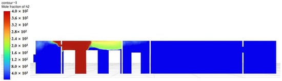 To validate the correctness of this study’s three-dimensional model, identical initial conditions were adopted as those employed by Yuan et al. [6]: 100% hydrogen composition in the pipeline; uniform parameters throughout the computational domain; a circular leakage orifice maintaining constant diameter and leakage rate during continuous leakage; adiabatic walls in the computational flow field; ambient pressure of 101 kPa; consideration of gravity and buoyancy effects on hydrogen dispersion with gravitational acceleration vertically downward (9.81 m/s2) and buoyancy-driven diffusion enabled; a 3/8-inch Type 316 stainless steel hydrogen supply pipe with leakage pressure of 1.2 MPa, yielding a mass flow rate of 0.14795 kg/s according to Equation (7). Hydrogen concentration distributions were compared at identical leakage locations, with Figure 5 and Figure 6 presenting comparative results of hydrogen diffusion paths and concentration profiles between this model and the two-dimensional model by Yuan et al. [6].