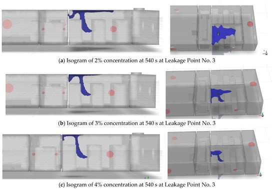 In addition, at 540 s, the simulation results when the concentration isosurfaces are 2% to 4%, respectively, are shown in Figure 11.