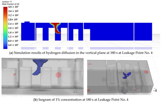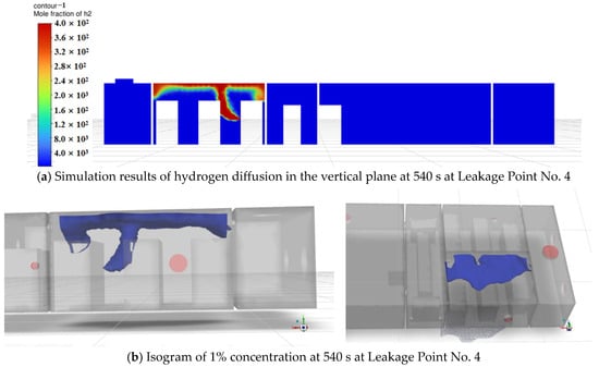 Numerical simulations were conducted for hydrogen diffusion processes over 540 s following leakage at Points 1–4. Simulation results on the vertical plane containing Leakage Point 1, along with diffusion patterns at the 1% concentration isosurface across different time steps (Figure 8, Figure 9 and Figure 10), demonstrate progressively expanding hydrogen dispersion. At 180 s, hydrogen remained concentrated near the leak orifice with a maximum horizontal spread of 1.23 m and vertical dispersion of 1.32 m. By 360 s, the dispersion range significantly increased to 4.17 m horizontally and 3.78 m vertically, with concentration gradients gradually flattening. At 540 s, diffusion extended further to 5.04 m horizontally and 3.95 m vertically, with hydrogen approaching the stern compartment boundary.