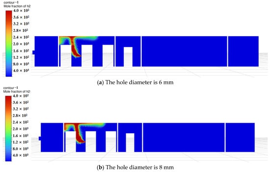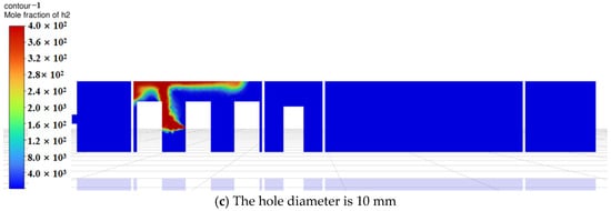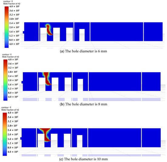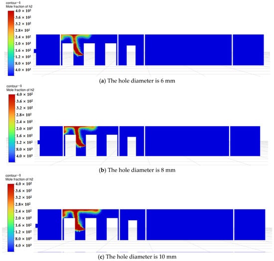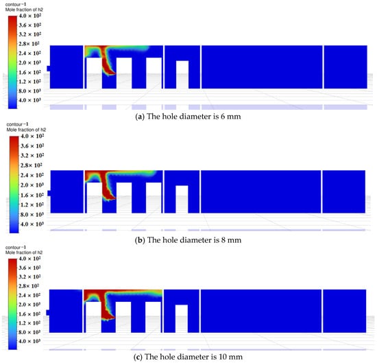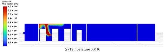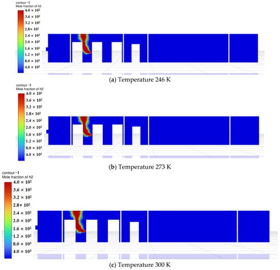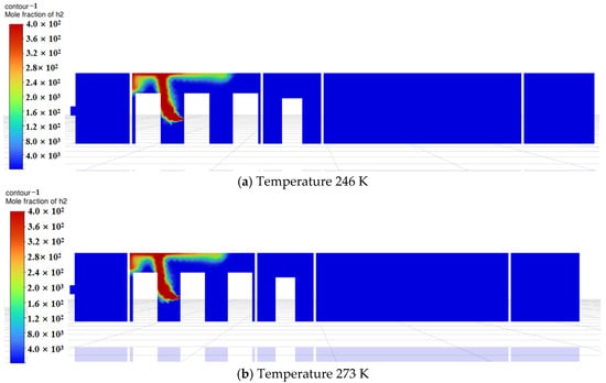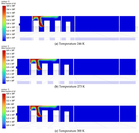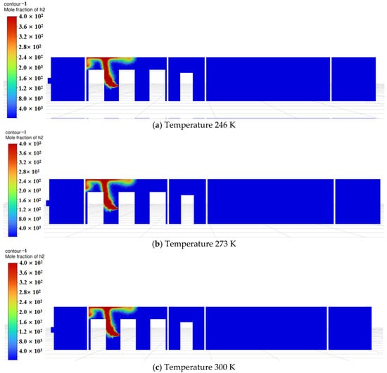 Based on the above findings, during the initial diffusion phase, temperature significantly affects hydrogen’s initial buoyancy and diffusion speed. At low temperatures (246 K), hydrogen rises more slowly, while at room temperature, diffusion occurs faster. As time progresses, hydrogen gradually mixes within the compartment, and natural ventilation becomes the dominant factor, driving the system toward dynamic equilibrium. At this stage, minor temperature variations exert reduced influence on the overall distribution, causing simulation results at different temperatures to converge. Furthermore, ambient temperatures near room temperature (273 K and 300 K) exhibit limited impact on hydrogen diffusion. This occurs because hydrogen density decreases as temperature rises, but within the near-room-temperature range (273 K–300 K), density changes are relatively minor, resulting in limited buoyancy differences. Additionally, although the diffusion coefficient is positively correlated with temperature, the temperature difference between 273 K and 300 K is only about 10%, and its practical effect on the diffusion rate may be overshadowed by ventilation airflow.