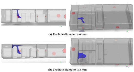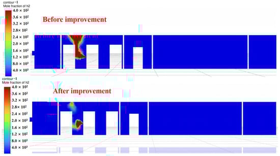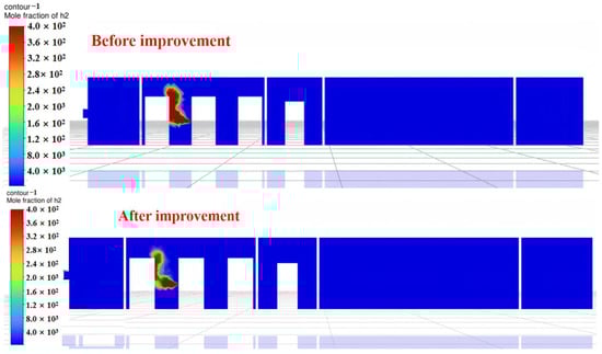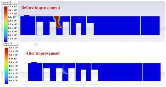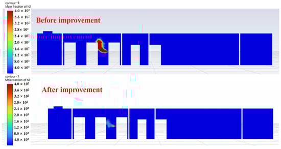 A comparison reveals that after adding ventilation openings and exhaust fans, both the volume of leaked hydrogen and the high-concentration zones are significantly lower than before the modifications. Notably, at 160 s, the exhaust fans effectively extract a portion of hydrogen from the compartment, suppressing hydrogen buildup near the ceiling.