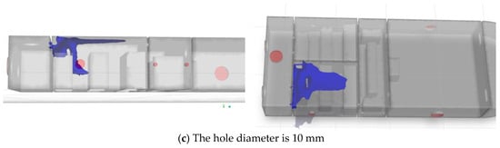 Two ventilation openings of identical size (3 m in height) were positioned on both the left and right sidewalls of the compartment, as illustrated in Figure 42 and Figure 43. All openings were defined as “pressure-outlet” boundaries with a gauge pressure set to standard atmospheric pressure, a turbulence intensity of 5%, and a hydraulic diameter of 0.5 m. To validate this measure, this study will conduct improvement analyses focusing on Leak Point 2 (with the fastest diffusion rate at a 10 mm diameter) and Leak Point 4 (exhibiting rapid horizontal diffusion). Fan selection requires special attention to explosion-proof requirements; all fans comply with ATEX Zone 1 standards and feature variable frequency speed control for flexible airflow adjustment according to actual needs.