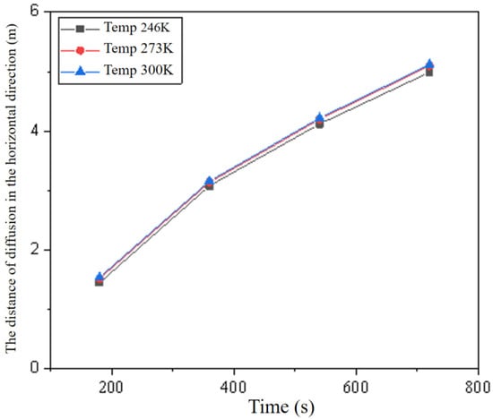 A temperature sensor was installed 1 m directly above the leak source. Under the 246 K operating condition, the recorded temperature increased to 251 K by 540 s, attributable to the heat release from hydrogen–air mixing. The resulting temperature difference—only about 4 K compared to the scenario starting from 273 K—further confirms the limited impact of the initial temperature on dispersion behavior.
