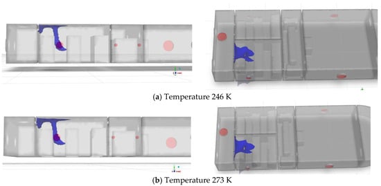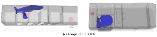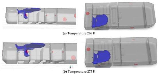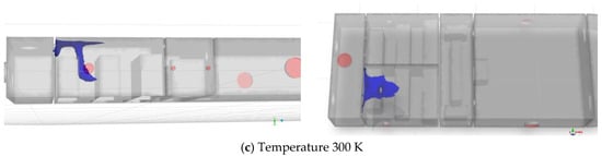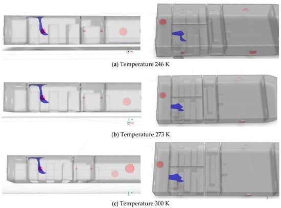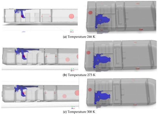 Simulation results at 720 s under different environmental temperatures are compared in Figure 38, Figure 39, Figure 40 and Figure 41, where the concentration isosurfaces are set at 1% to 4%, respectively.