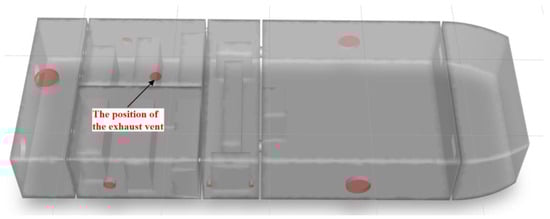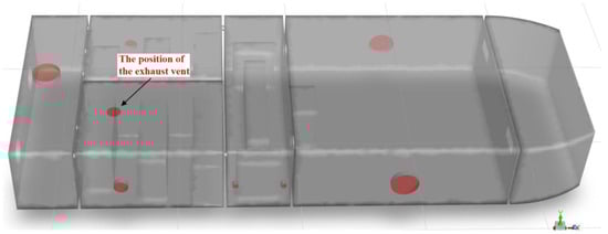 Based on the simulation findings, an exhaust fan installation position (500 mm diameter, exhaust velocity of 5 m/s) was designated at the high-concentration accumulation area on the compartment ceiling. The installation locations for Leak Point 2 and Leak Point 4 are illustrated in Figure 42 and Figure 43, respectively.