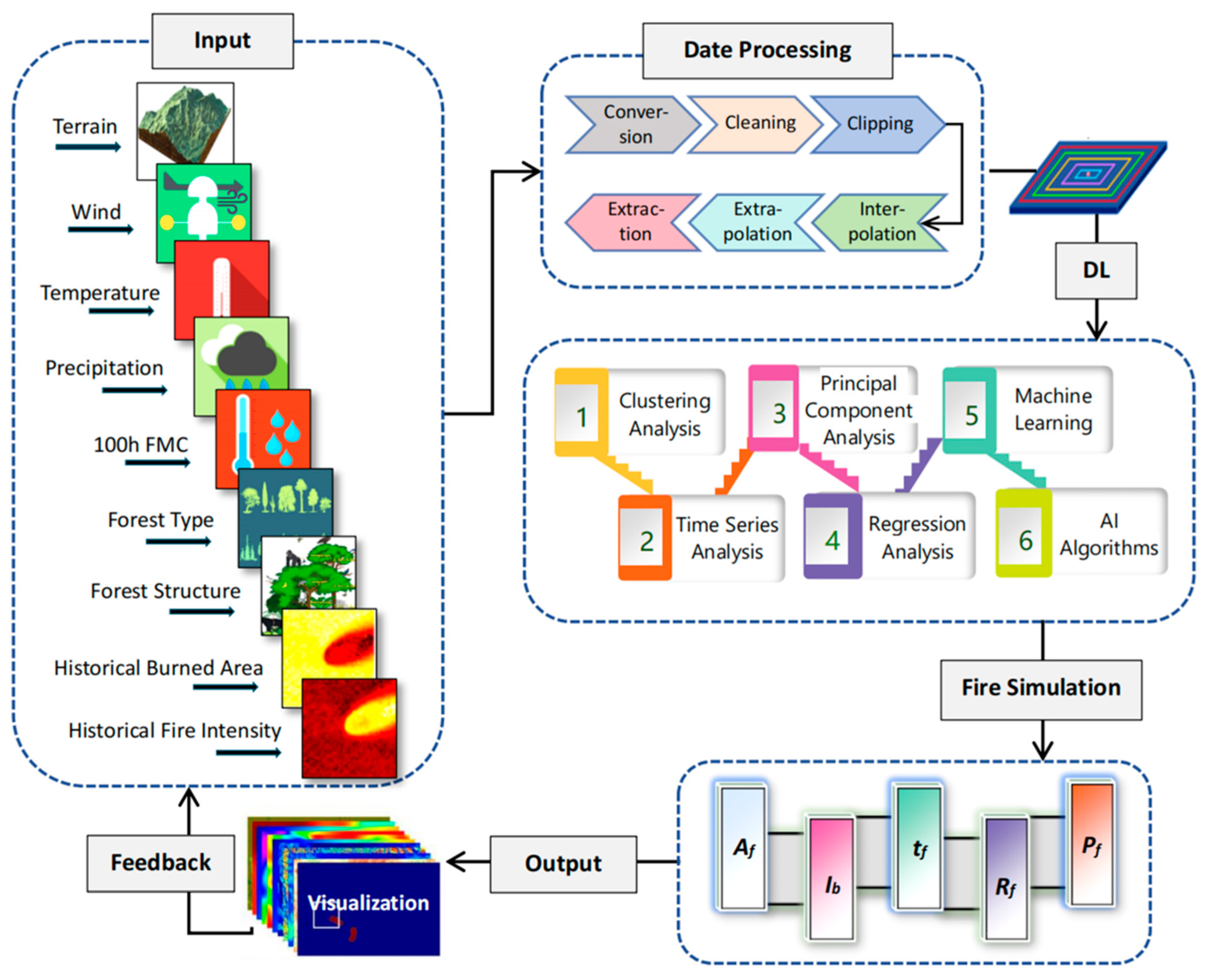 Data-driven models are based on extensive historical datasets and utilize statistical and machine learning techniques to reveal hidden relationships among variables. These models establish mapping relationships between input variables and fire behavior parameters. Their primary methods encompass statistical regression analysis, time series analysis, and analogy approaches that rely on data similarity and pattern recognition [67,68]. As shown in Figure 3, the input variables for predicting fire behavior usually include meteorological data, topographic data, and vegetation data. The output variables are key parameters such as spread rate, fire intensity, and burned area. By learning from large amounts of historical fire data, data-driven models can capture the nonlinear relationships among these variables, enabling the dynamic prediction of wildfire behavior and helping to identify the most effective measures for fire management [67,68]. These models are particularly useful in regions with extensive historical data, where they can leverage past events to improve predictive accuracy and provide valuable insights for proactive fire management strategies.