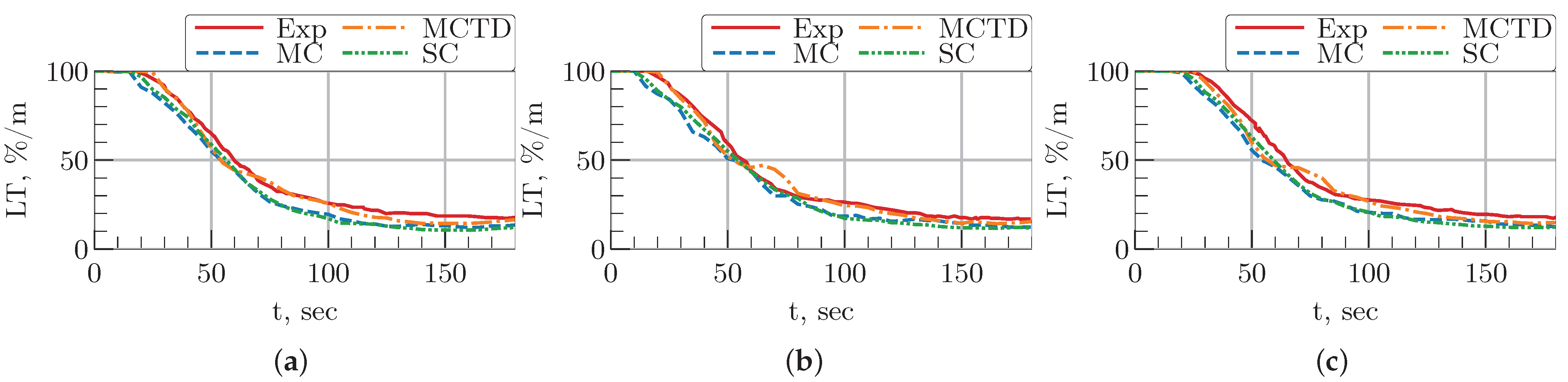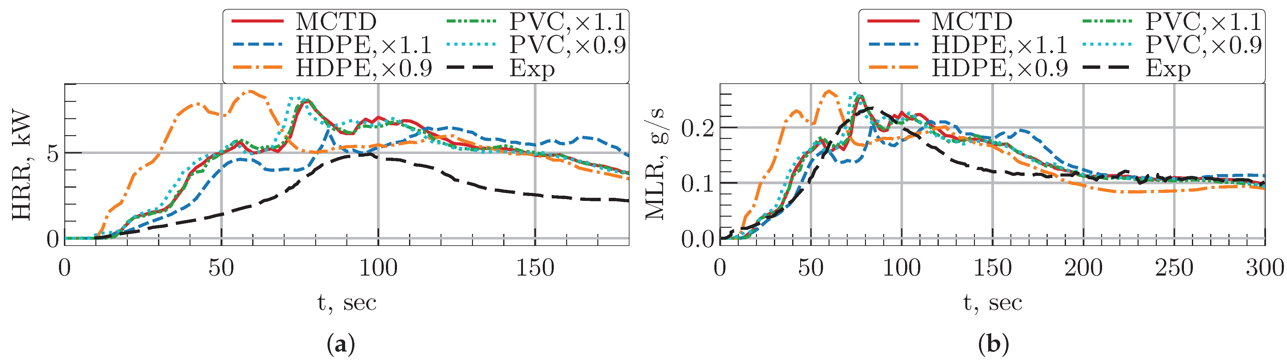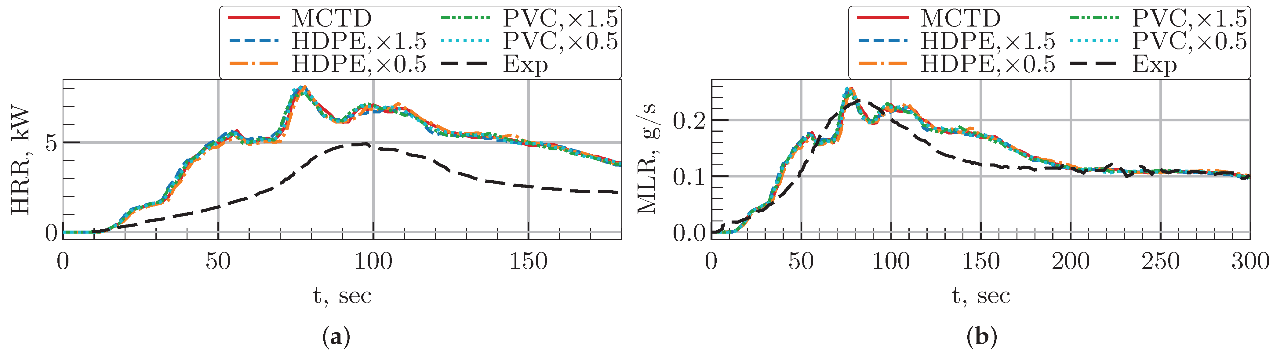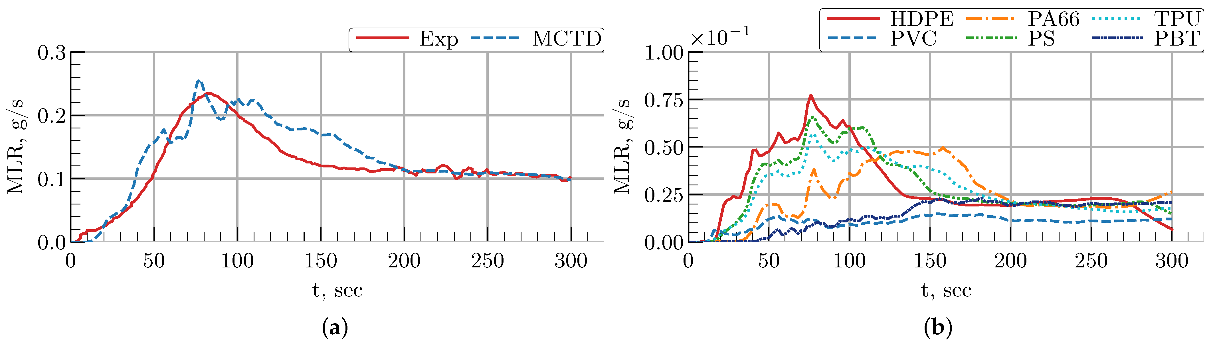 t = 300 s, these values are 40.0 g and 36.4 g, respectively. From the time of 200 s after ignition to the end of the simulation, the MLR curve in the MCTD case perfectly matches the experimental one. Despite minor deviations, these results demonstrate that the MCTD model predicts mass loss with reasonably high accuracy, capturing the overall degradation behavior effectively.