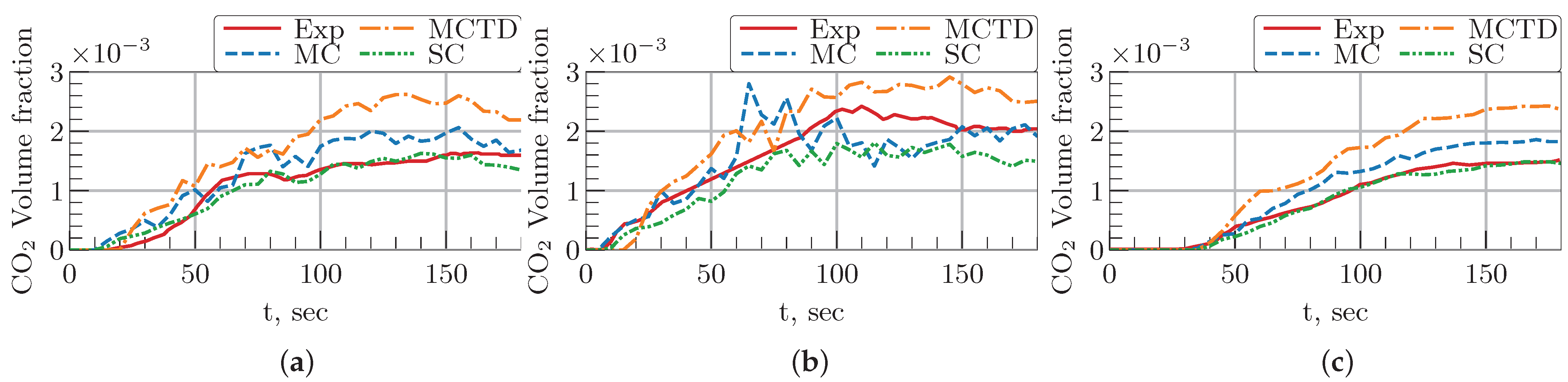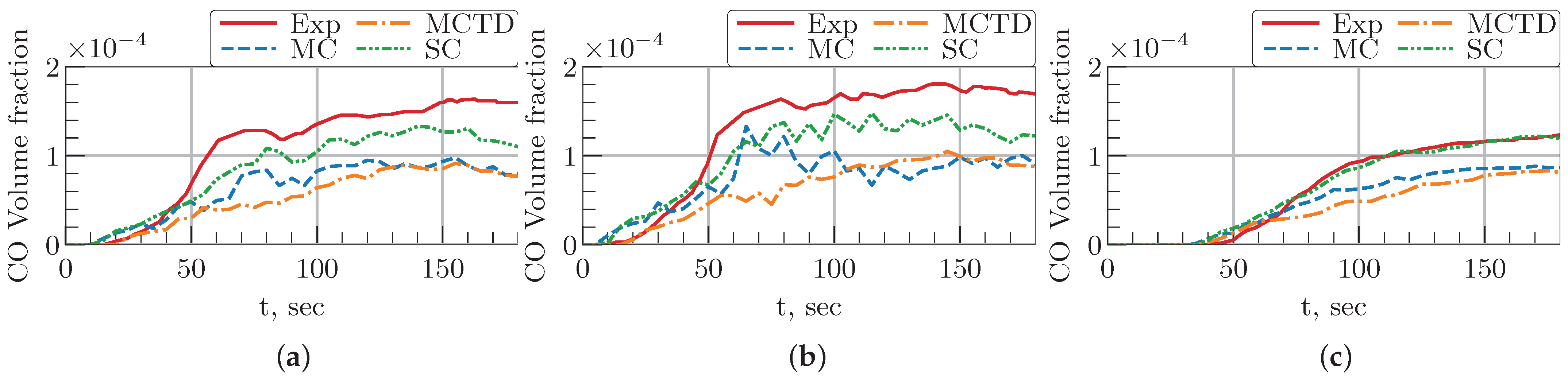 Figure 6 compares the predicted CO concentrations in different simulation cases. The results for every simulation case underestimate the experiment. For the MC and MCTD cases, the CO concentration trends show close agreement with each other. At
