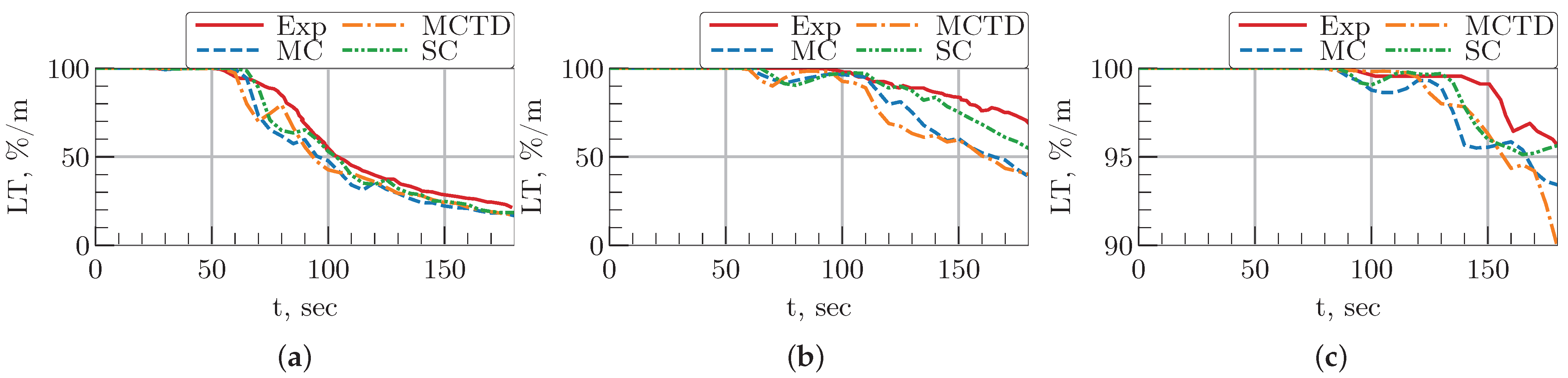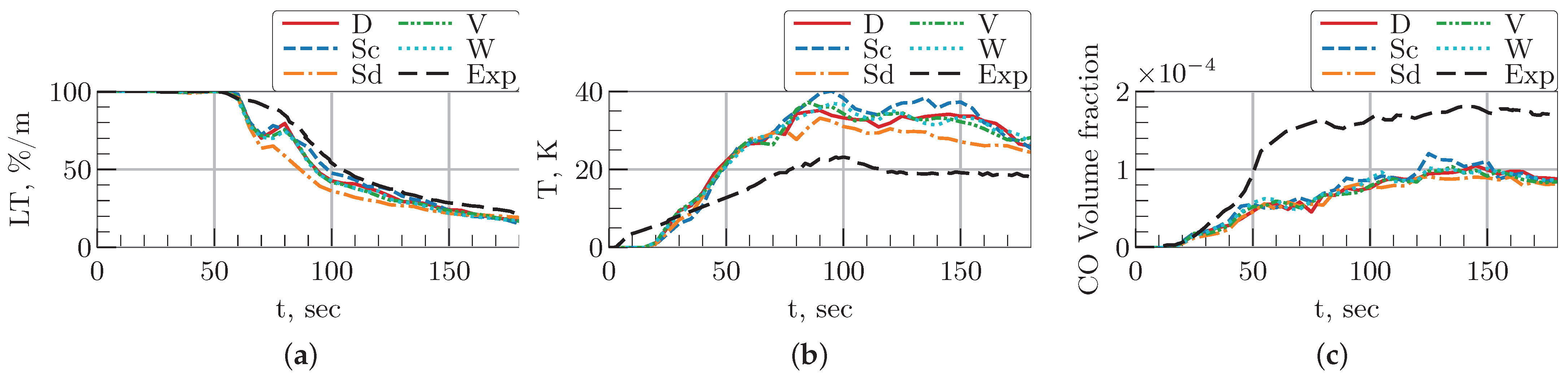 Figure 11a,b). Specifically, the Sd model predicts lower light transmission between 70 s and 140 s and a lower temperature between 90 s and 180 s. In contrast, its prediction of CO concentration aligns closely with the other models, showing no significant deviation.