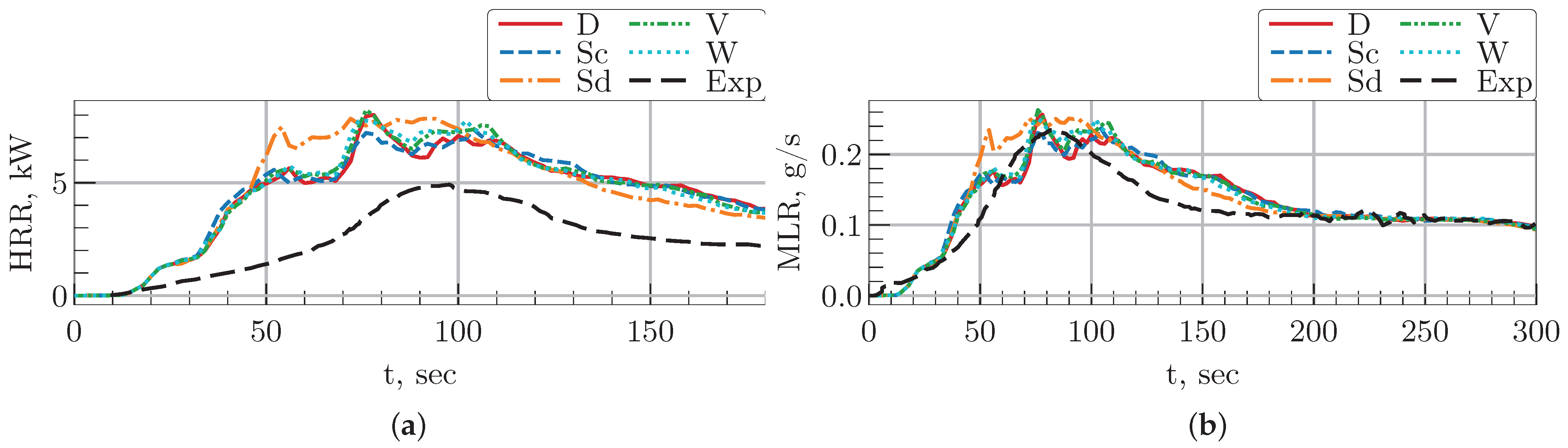 Figure 10. The results indicate that four of the five models (D, Sc, V, W) produced very similar predictions for both HRR and MLR. A notable exception was the Sd model, which demonstrated a substantial deviation from the other models during the period from 50 s to 70 s. However, it demonstrated smoother growth of the MLR and HRR curves without substantial oscillations, which reflects a closer agreement with the experimental trend of these parameters.