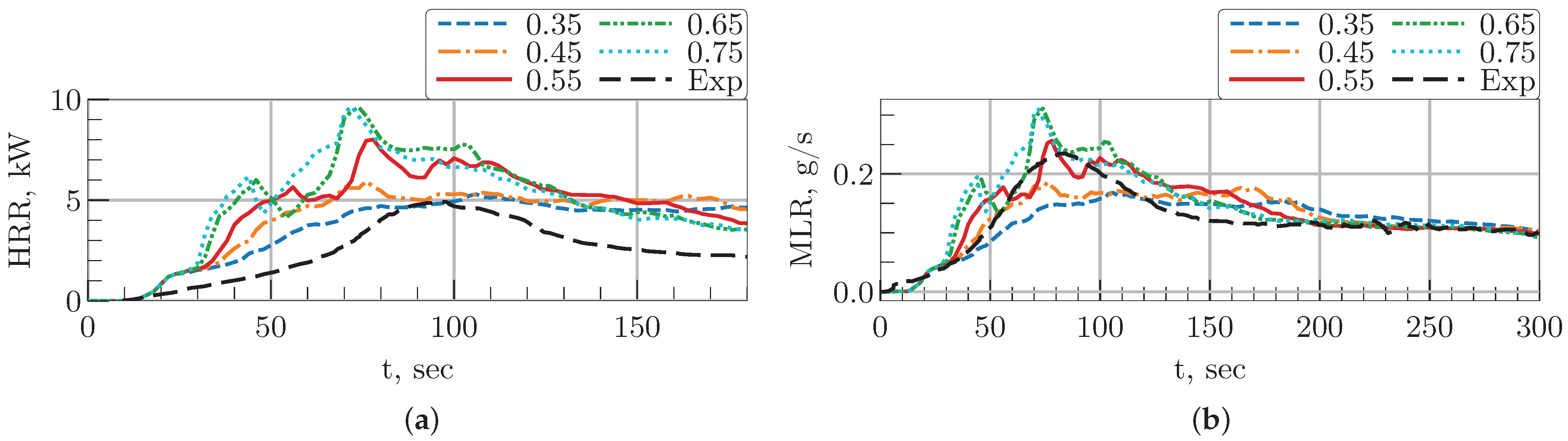 Figure 12. The radiative fraction demonstrates a pronounced influence on the simulated mass loss rate and heat release rate, underscoring the critical role of radiative heating. Higher RF values (0.65, 0.75) resulted in significantly more intense combustion, with peak HRR and MLR values of 9.7 kW and 2.4 g/s, respectively. In contrast, a lower RF of 0.35 produced an attenuated response, characterized by a smooth HRR curve that reached a maximum of 5 kW at t = 100 s, with a corresponding peak MLR of only 0.17 g/s.