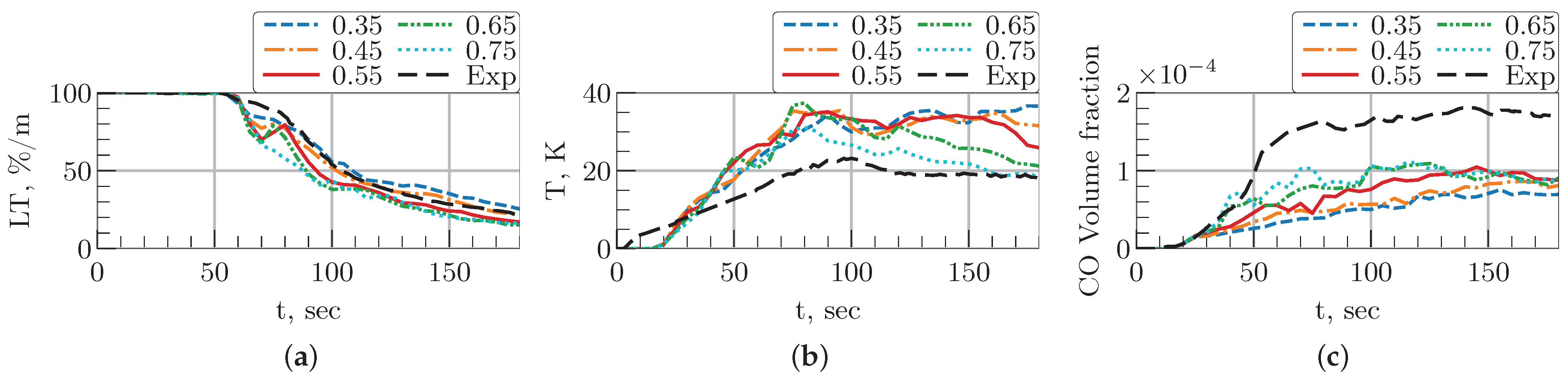 Figure 13). Simulations show that lower RF values result in higher LT values, which is attributed to a lower MLR and a corresponding reduction in soot production. The case with RF = 0.75 exhibits the greatest deviation from the experimental LT data, with an error of approximately 20% at t = 80 s. In contrast, an RF of 0.45 provides the best fit to the experimental curve from t = 100 s onwards. Temperature dynamics within the compartment are also strongly dependent on the RF. Simulations with a lower RF predict a higher compartment temperature. This result is logical from an energy balance perspective: a lower radiative fraction implies a greater proportion of the total energy is transferred via convection, directly heating the surrounding gases rather than being radiated back to the fuel surface or lost. All simulated cases except those with RF = 0.35 predict the peak temperature at approximately t = 75–80 s, but the values diverge significantly by t = 180 s. At this time point for RF = 0.35, the maximum temperature value of 36 °C is reached. As expected, the simulated CO concentration closely follows the MLR curves, with a higher MLR producing greater quantities of combustion products, including CO. At t = 180 s, the model predicts CO concentrations between 6