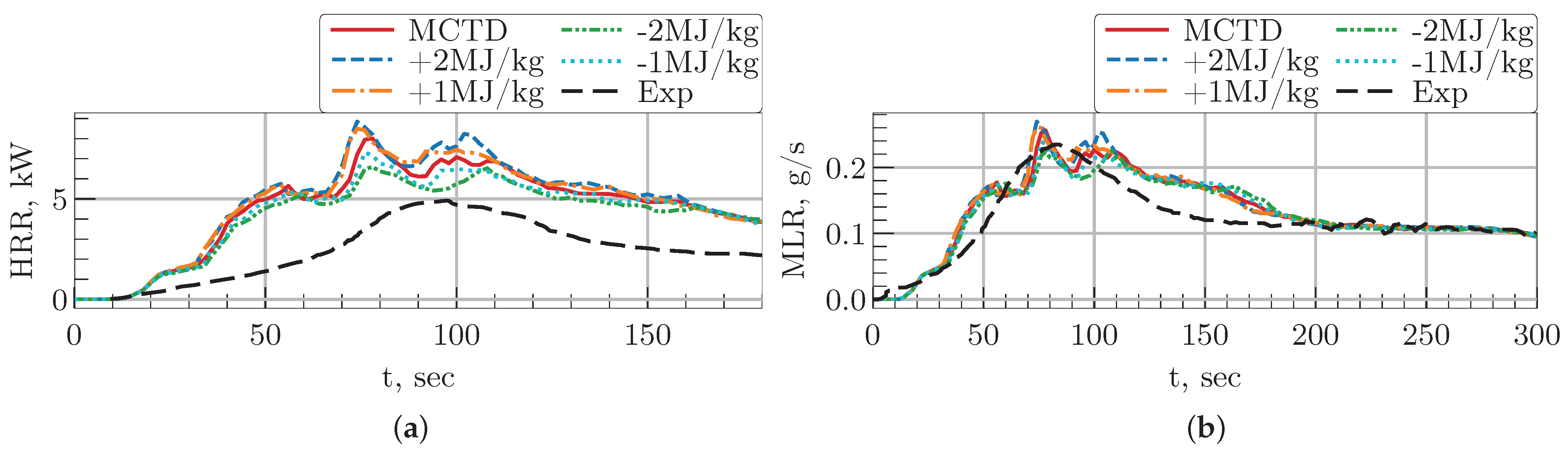 Figure 14 presents the resulting MLR and HRR curves. The labels on the graphs indicate the relative shift in HOC (in MJ/kg) from the initial MCTD simulation case for every polymer component. The results confirm a direct, positive correlation between the HOC and the peak HRR. A reduction of 2 MJ/kg for each component decreased the maximum HRR from 8 kW (baseline) to 6.5 kW. Although this change lowered the fire intensity, the overall temporal progression of the HRR remained consistent. In contrast, the MLR demonstrated negligible sensitivity to variations in HOC. The maximum divergence between the MLR curves was only 0.04 g/s (15% of the peak value), and this minor discrepancy was confined to a single time point at t = 93 s.