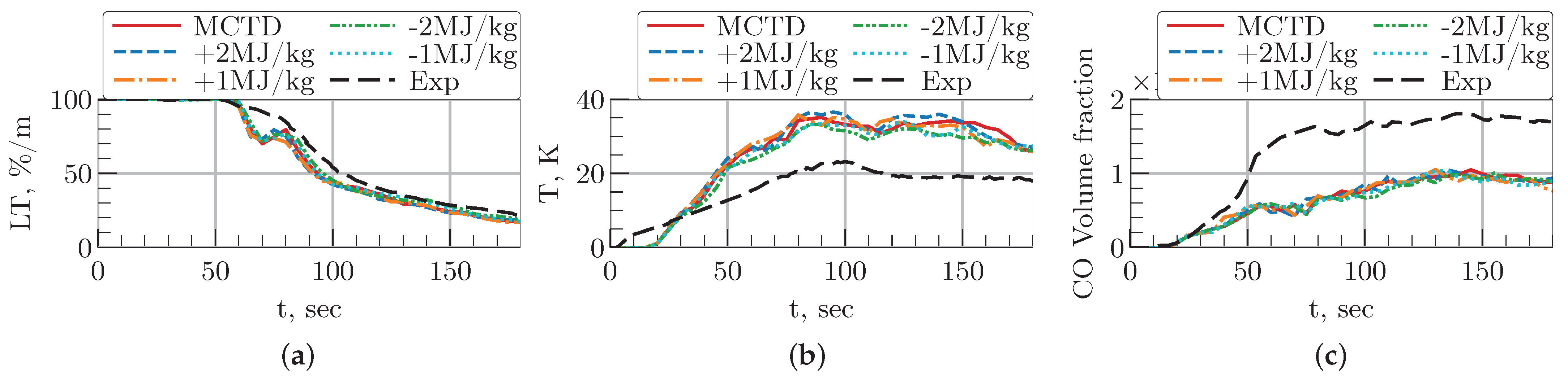 Figure 15 presents the simulated temperature, light transmission (LT), and CO concentration dynamics. The results demonstrate that these parameters are largely insensitive to the investigated changes in the heat of combustion. As evidenced by