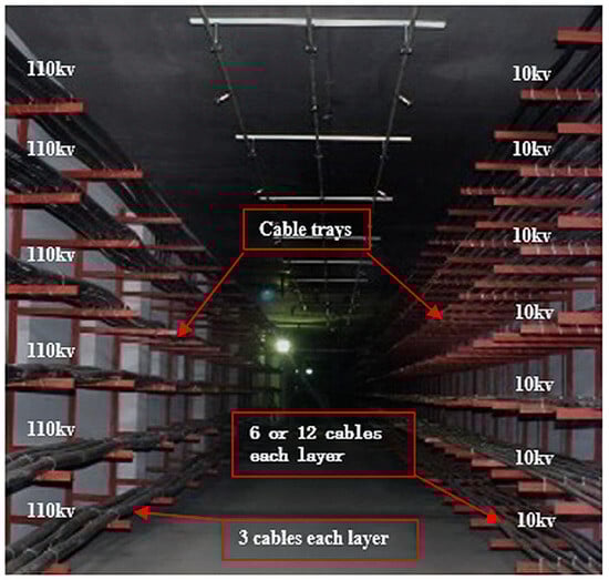 The experiments were conducted in a full-scale utility tunnel at a research and development base. The tunnel measures 95 m in length, 3.4 m in width, and 2.9 m in height. Cable trays with a width of 750 mm were installed on both sides of the tunnel. A seven-layer cable tray system was mounted on one side of the tunnel. The vertical spacing between adjacent layers was 350 mm, with the lowest tray layer installed 300 mm above the tunnel floor. Depending on the test conditions, each layer on this side was loaded with either six or twelve 10 kV flame-retardant cables. The opposite side was equipped with a six-layer cable tray system, featuring a larger inter-layer spacing of 400 mm. The lowest tray layer of this system was also positioned 300 mm above the floor. Each layer on this side carried three 110 kV flame-retardant cables. The on-site layout of the full-scale utility tunnel is presented in Figure 1.