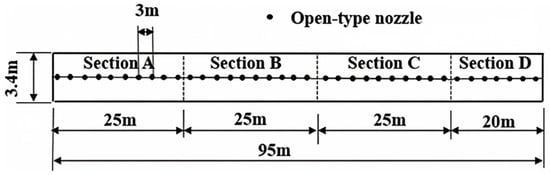 The HWMFES employed a total-flooding application method. The utility tunnel was divided into four zones, labeled Section A through D, with lengths of 25 m, 25 m, 25 m, and 20 m, respectively. Nozzles were mounted vertically downward along the centerline of the tunnel ceiling, at a spacing of 3.0 m and a nozzle pressure of 10.0 MPa. Open-type nozzles with flow coefficients of K = 1.0 and K = 0.7 were selected in turn to investigate the fire extinguishing effectiveness the HWMFES and its cooling rate of under spray intensities of 1.0 L/(min·m2) and 0.7 L/(min·m2), respectively. The utility tunnel zoning and the nozzles layout are illustrated in Figure 2.