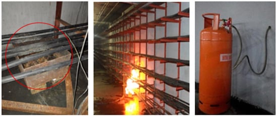 The fire source was configured according to the standardized method specified in The Technical Code for Water Mist Fire Extinguishing Systems (GB 50898-2013) []. A propane burner with a HRR of (250 ± 25) kW was employed to ignite the cables. The fire source was positioned under the lowest tray layer on the side with the seven-layer cable tray, specifically in the middle of Zone B, and located between two water mist nozzles as recommended. The fire source layout and the propane burner are provided in Figure 3.