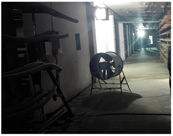 In accordance with the Technical Code for Water Mist Fire Extinguishing Systems (GB50898-2013), full-scale fire experiments for WMFES in cable tunnels and basements should be conducted under controlled longitudinal ventilation. The code stipulates that ventilation speed must be measured and adjusted prior to testing, with the measurement point situated at the center of the tunnel’s pedestrian pathway and the ventilation speed at the measuring point should not be less than 1 m/s []. Additionally, for open systems operating in local application mode, the ventilation speed around the protected object should not exceed 3 m/s []. In line with these specifications, a movable ventilation fan was installed in the utility tunnel for this study to conduct HWMFES fire extinguishing experiments at a ventilation speed of 2 m/s. Figure 4 shows the ventilation fan layout within the utility tunnel.