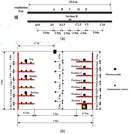 Layout of measurement points: (a) Top view of Zone B; (b) Fire source cross-section.