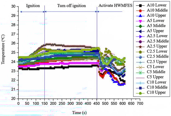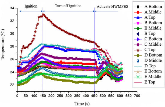 In Test Condition 1, which served as the baseline scenario without HWMFES activation, twelve 10 kV flame-retardant cables were loaded in each tray layer on the fire source side, while three 110 kV flame-retardant cables were placed on each tray layer on the opposite side. The experiment commenced at 0 s. The propane burner was ignited at 10 s to initiate the cable fire and deactivated at 150 s. The HWMFES was subsequently activated at 450 s to extinguish any residual flames. Figure 6 illustrates the temporal variation in temperature measured on different tray layers directly above the fire source.