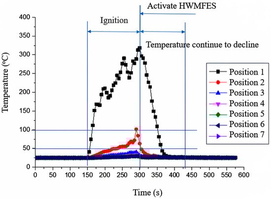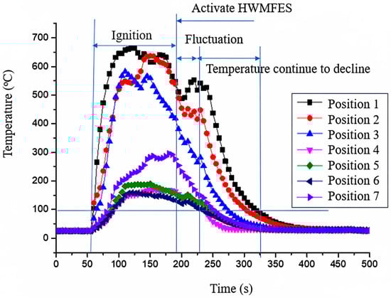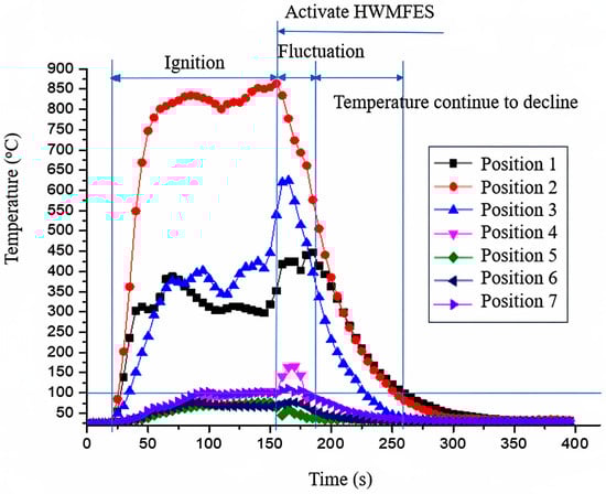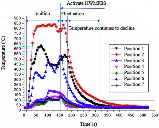 Figure 9 and Figure 10 present the temporal variations in spatial temperature directly above the fire source for the two test conditions, respectively. As observed in the figures, the peak temperature recorded during the ignition phase surpassed 830 °C under both test conditions. After HWMFES activation, temperatures at most locations experienced a brief period of fluctuation followed by a continuous decrease, except for Position 2 in Test condition 3, which exhibited a relatively stable temperature drop with minimal fluctuation.