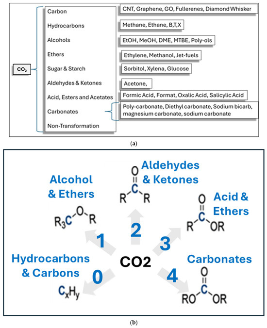(a) Chemical compounds that have been successfully synthesized from carbon dioxide gas CO2 from lab scale to commercial scale as compiled by LeClerc (2025) [9] with emphasis given to carbonates. (b) Five types of CO2 reaction based on the number of bonds between the primary carbon and electronegative oxygen (“reduction level”) for the variety of chemical classes.