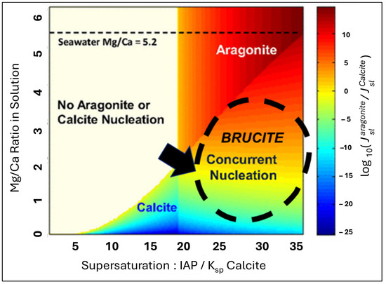Firstly, in building up the hypothesis of this work, we consider the study by Mitchell et al. [50], which proposed a kinetics model where calcium carbonate precipitation is susceptible to relatively slow formation kinetics. Secondly, from the molecular simulation work of WenHao S. et al. [51], the effect of Mg2+ incorporation on the calcite surface energy was found to drastically inhibit calcite nucleation. Surface energies are obtained from Discrete Fourier Transform DFT computations of hydrated calcium carbonate surface slabs with partial Mg2+ substitution on calcium sites, as shown in Figure 2. The kinetic phase diagram study showed that for the ratio of Mg/Ca = 5.2 (modern seawater), only aragonite is preferred to nucleate, while concurrent nucleation of calcite and aragonite occurs for a broad span of supersaturations near Mg/Ca = 2, which potentially yields brucite or hydro magnesite.