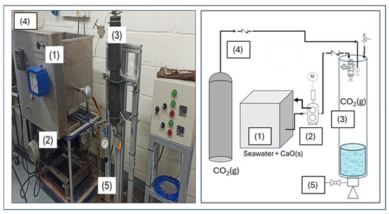 The actual image of the continuous reactor skid (left image) used to produce the fire-retardant magnesium-based compounds with components (1) feed tank, (2) positive displacement type pump, (3) 0.8 L continuous mineral carbonation reactor, and (5) backpressure regulator and liquid flow rate valve controller and simplified block diagram (right image) of the laboratory setup of the continuous reactor skid.