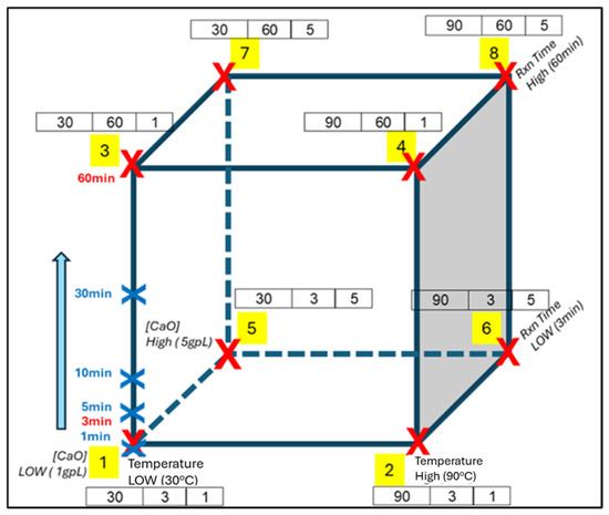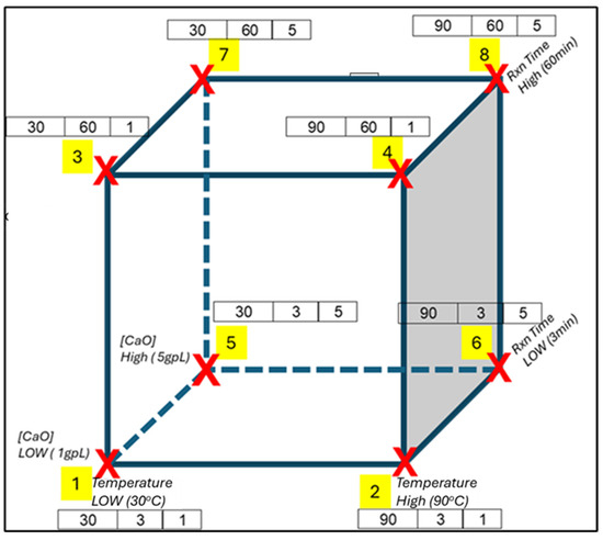 The Two-Level Full-Factorial Design was chosen as the design of the experiment methodology. The test consists of 24 runs: three parameters, two levels (high and low) with three replicates, totaling 24 runs. As shown in Figure 4 below, the parameters under investigation are as follows: (1) temperature: 30–90 °C, (2) concentration of CaO in seawater: 1 g/L and 5 g/L, and (3) reaction time: 3 and 60 min. The provisional equation for hydro magnesite, brucite, and huntite yield is as follows: