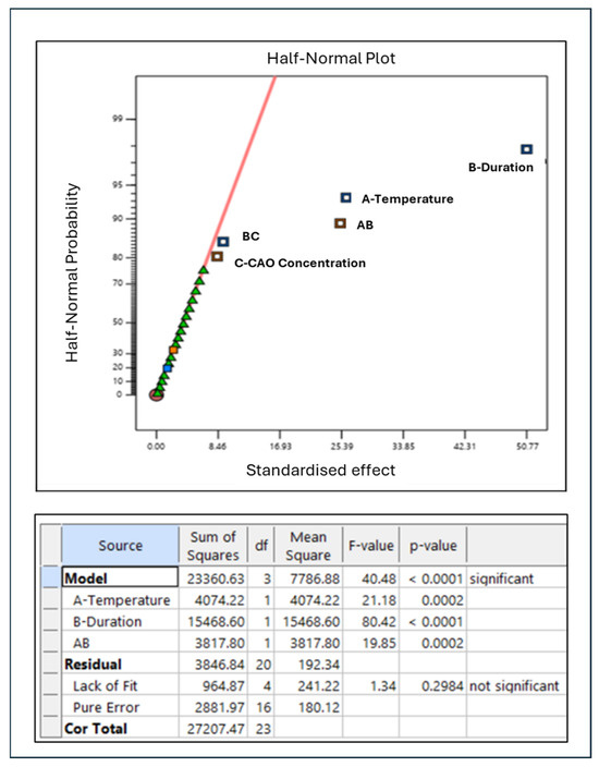 Top section, half-normal plot, for the individual factor responses A, B, and C and two-way interaction factor responses AB and BC (top figure), and (bottom section) table comprising the sum of squares and p-value for the individual factor responses A, B, and C; two-way interaction factor responses AB and BC; and final model for the yield of magnesium complex compounds.